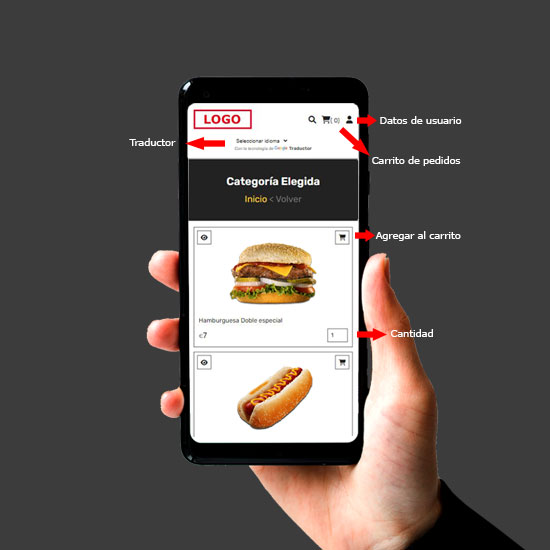 - Menú digital donde se muestran todos tus productos con: fotos, descripciones y precios. Separado por categorías ejemplo: comidas, bebidas, postres. etc.